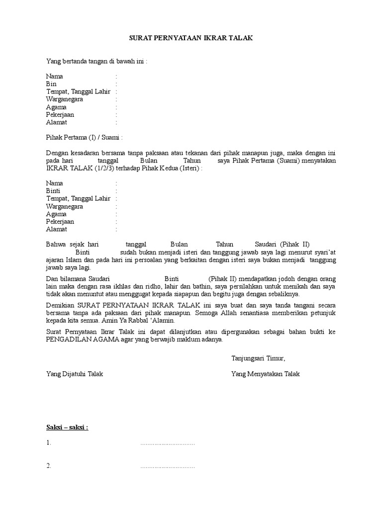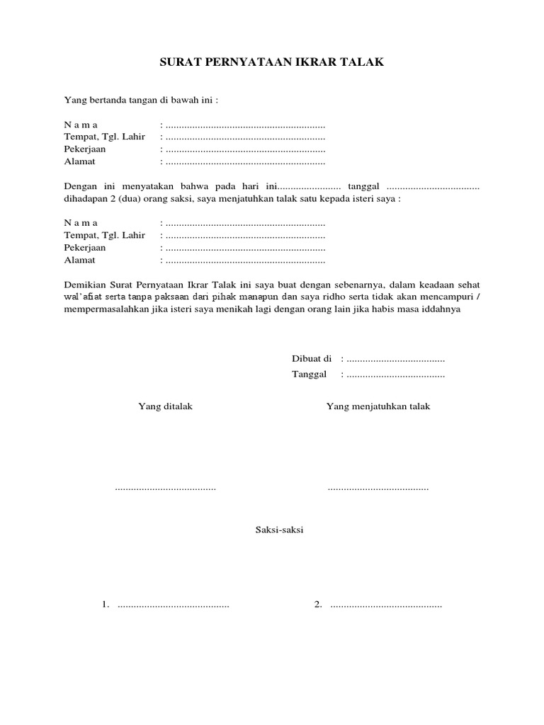 Surat pernyataan ikrar talak cerai yang bertanda tangan di bawah ini saya : Unduhsebagai docx, pdf, txt atau baca online dari scribd. Ibu rumah tangga alamat : Zulfi azwan tempat, tanggal lahirâ : Surat pernyataan ikrar talak.doc :